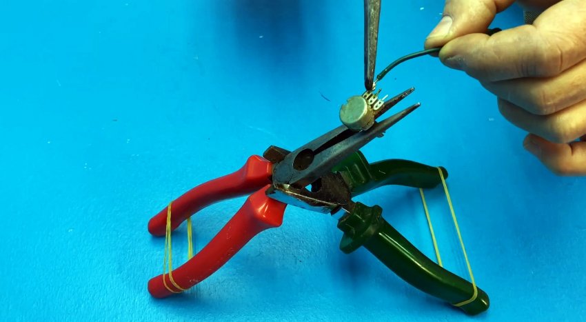 Тогда в губках инструмента можно мягко зафиксировать нужный радиокомпонент. Если еще и придержать эти плоскогубцы вторыми пассатижами с резинкой, то паять будет вообще очень удобно.
