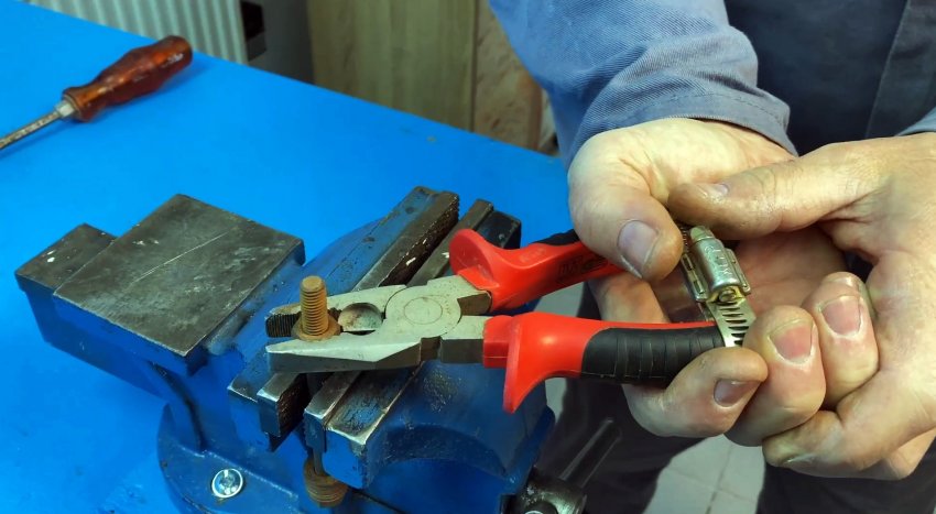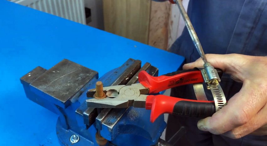 Если у вас нет гаечного ключа подходящего размера, тогда можно обойтись плоскогубцами. Захватите ими гайку. Затем стяните ручки инструмента червячным хомутом. После этого можно скрутить даже прикипевшую гайку.
