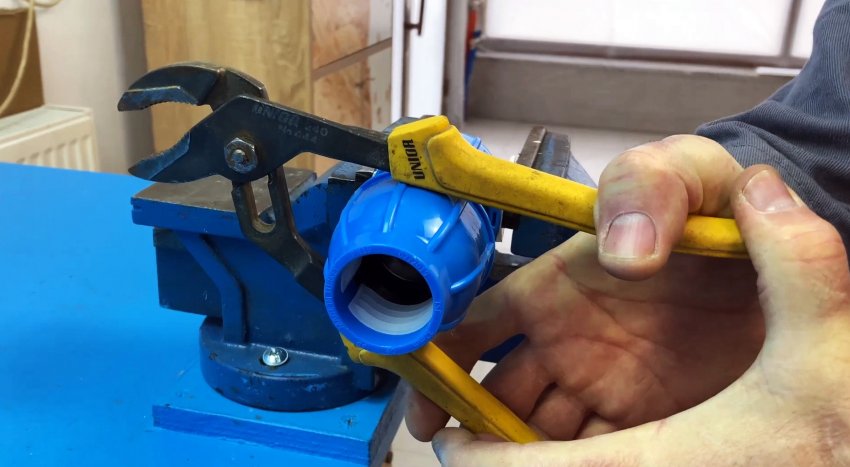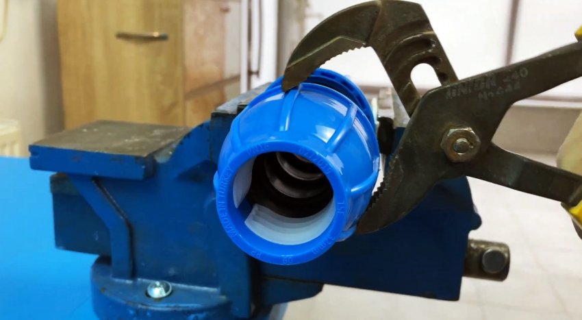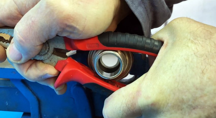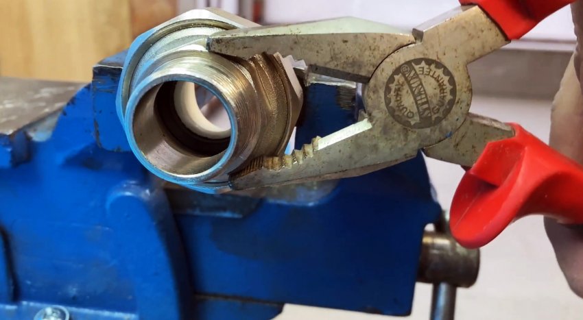 Также если нет разводного ключа, то большие гайки и муфты можно захватывать между ручек плоскогубцев. Нужно сильно их сдавить, и повернуть.