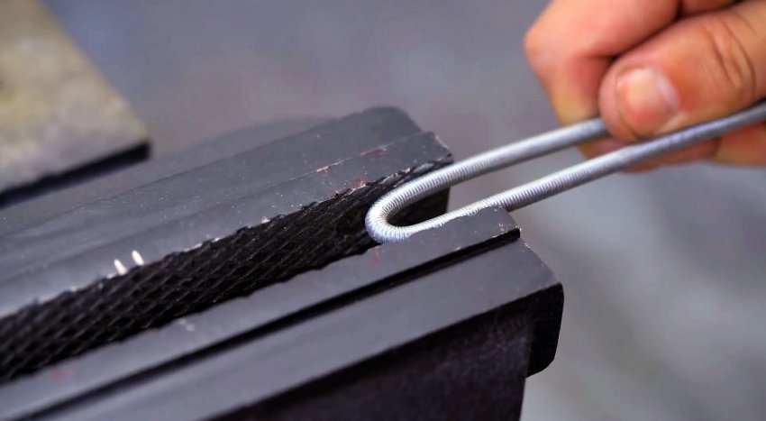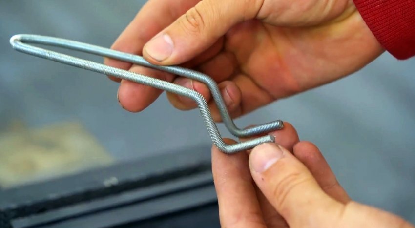 Берем длинную шпильку М6, и сгибаем ее пополам. Затем в тисках подгибаем края детали, как на фото.