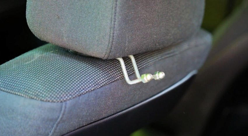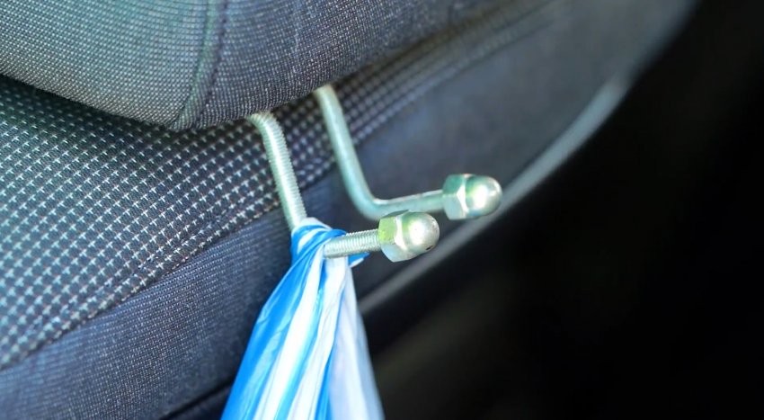 На края шпильки накручиваем колпачковые гайки. После этого цепляем вешалку за подголовник. Теперь за нее можно цеплять пакеты со стороны заднего сидения.