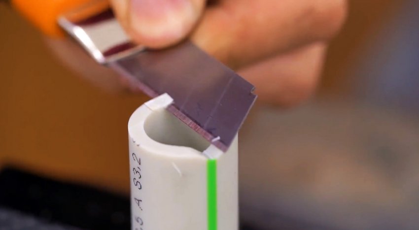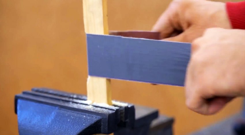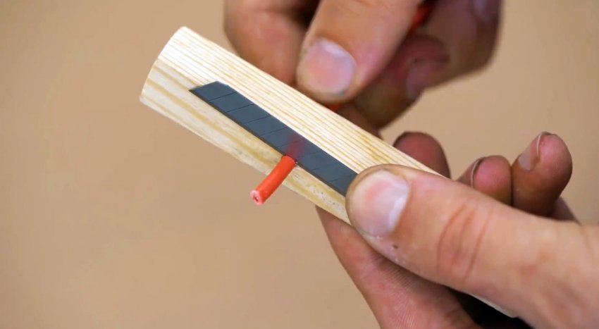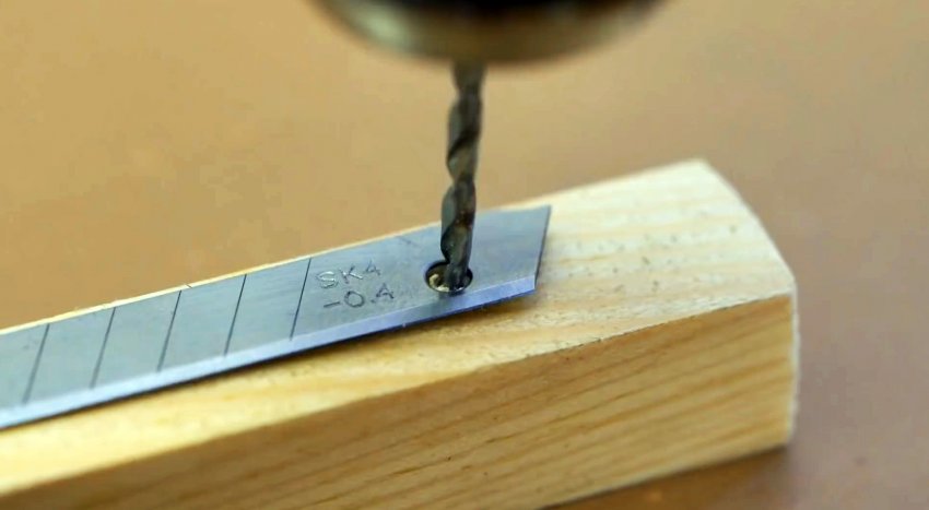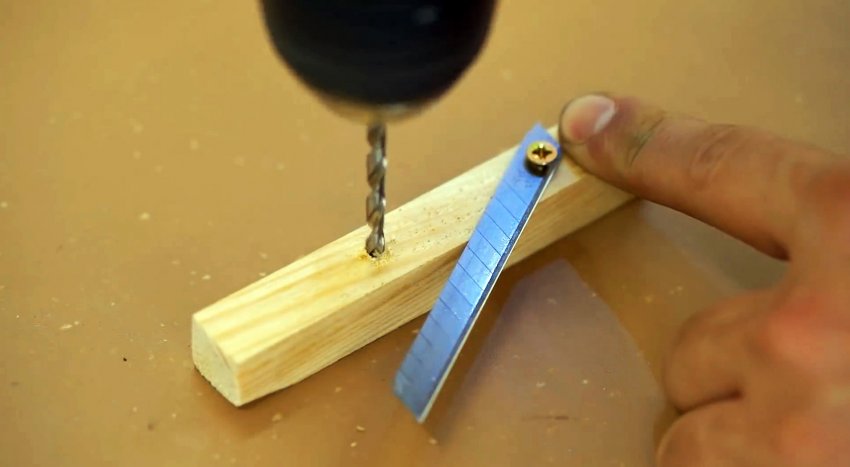 Берем небольшую реечку, и прикручиваем к ней лезвие монтажного ножа. Затем немного дальше просверливаем ее насквозь.
