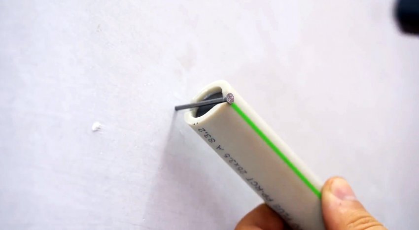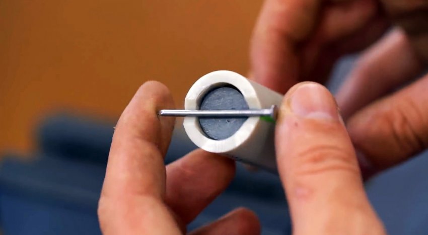 Берем отрезок ПП трубы, и с торца вырезаем на его стенках небольшой желобок. Затем вставляем в трубку магнит подходящего диаметра. Теперь этой трубкой можно держать гвозди.