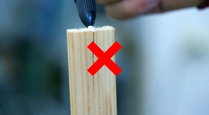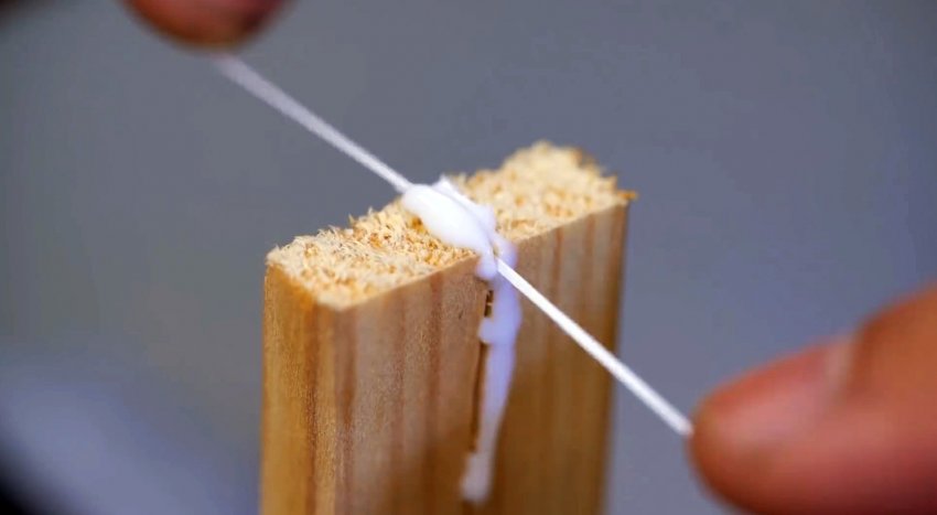 При склейке трещин в деревянных заготовках клей внутри можно распределить с помощью нитки. Так получится смазать все поверхности.
