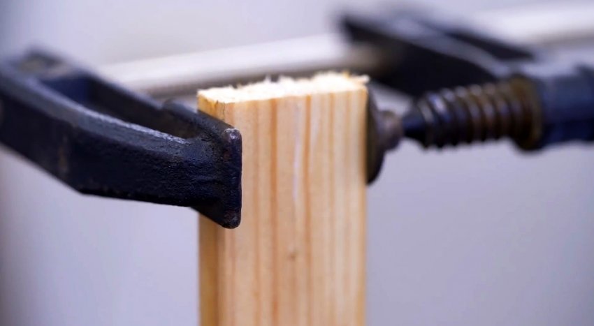 Если к торцу большой детали нужно приклеить рейку или кромку, но есть только которая струбцина, это не беда. Склеиваем детали, и затем на основную устанавливаем струбцину. В получивший между ними зазор вбиваем длинный клин.