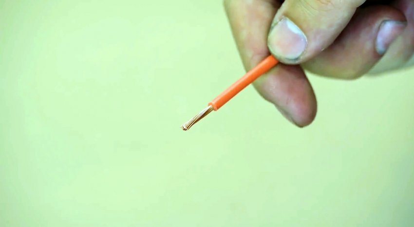 Теперь в сквозное открытие вставляем провод, и поджав к нему лезвием, прорезаем изоляцию. Остается провернуть проводок по кругу, и затем сорвать остатки изоляции.