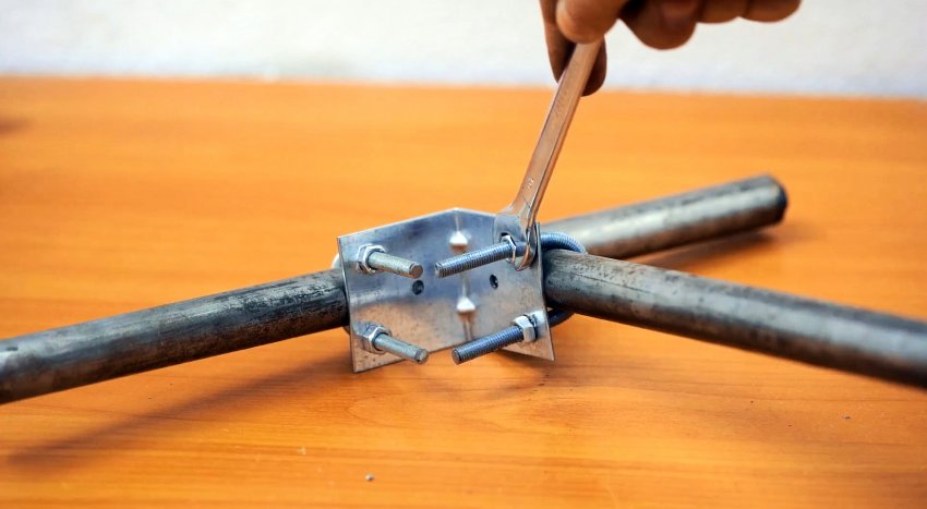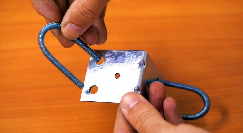 Из резьбовой шпильки сгибается две скобы. Вставляем их в монтажный уголок, и получаем готовый кондуктор. Им можно зафиксироваться две трубы под прямым углом. Это устройство позволяет выполнять сварочные работы без помощника, который будет поддерживать второй край трубы.