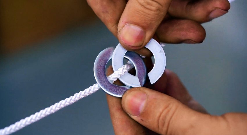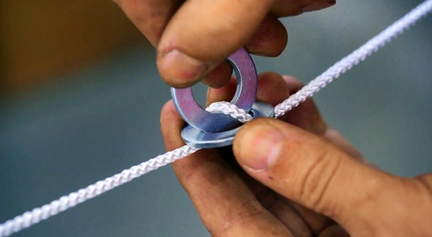 Теперь делаем обороты до полного натяжения шнура. Затем цепляем шайбу за веревку, чтобы та не провисла обратно.
