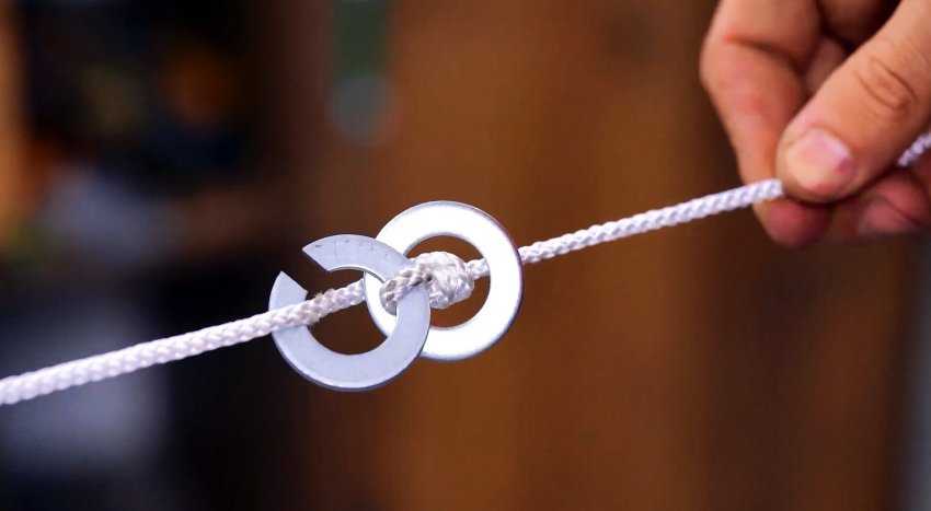 Сделайте пропил в одной шайбе. Затем приложите к шнуру вторую целую шайбу, и втяните его в ее отверстие. Вышедшая петля цепляется подрезанной шайбой.