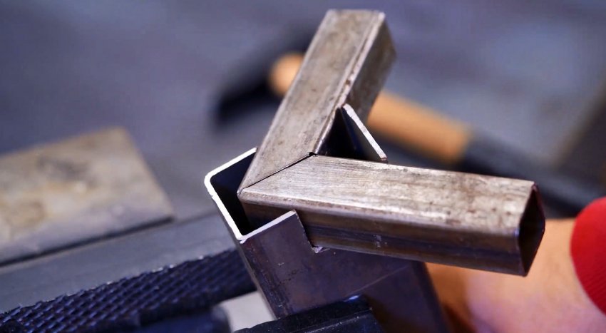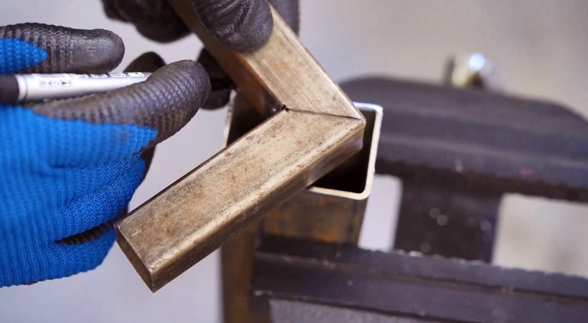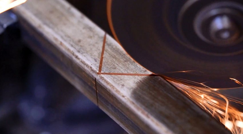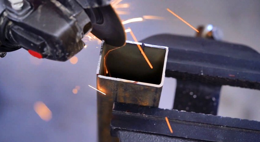 Чтобы сделать из профильной трубы угол 90 градусов, нужно вырезать на ее изгибе прямоугольный клин.