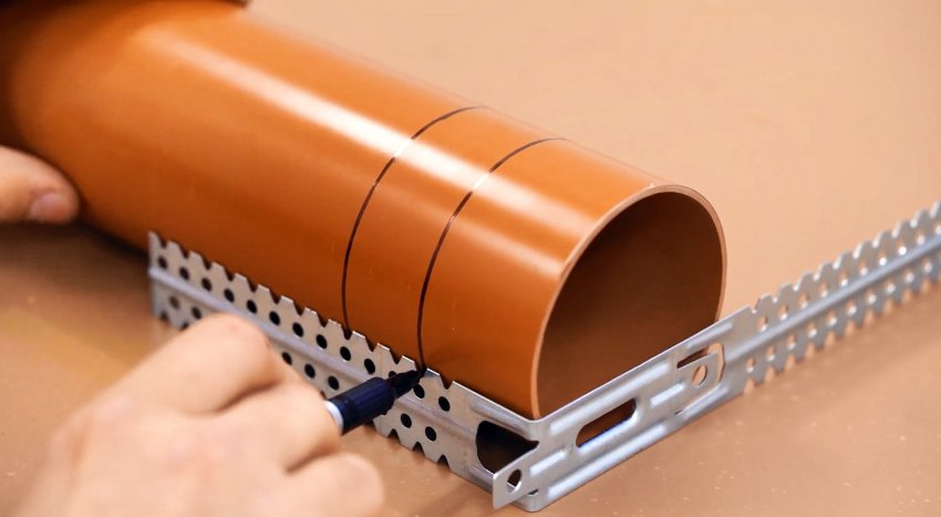 Чтобы быстро и просто разметить ПВХ трубу на ровные кольца возьмите прямой подвес для крепления оцинкованных конструкций. Согните по середине и по удобным отверстиям размечайте трубу в нужном месте, при этом вращая ее.