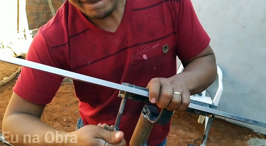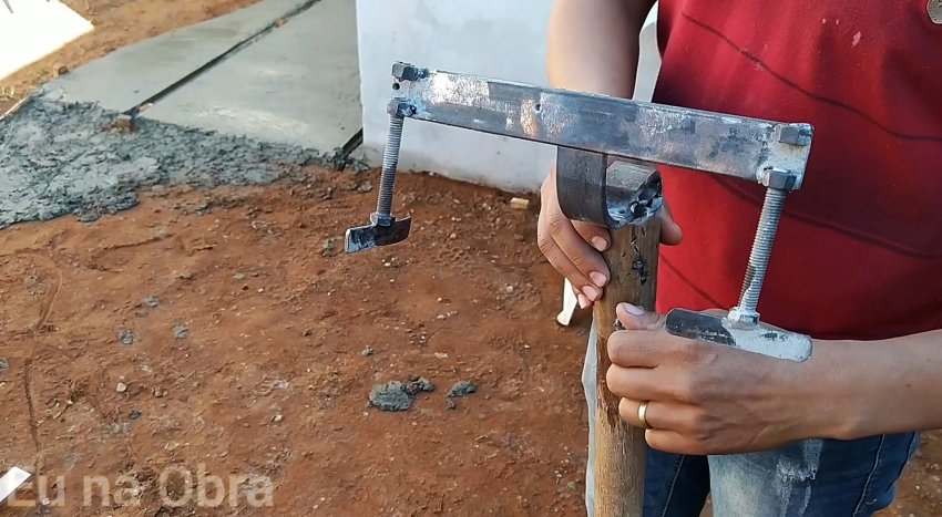 Снизу по краям к жесткой стальной полосе привариваем по две гайки, во внутренние из которых вворачиваем болты. К головкам болтов поперечно привариваем пластины для удобства вращения. Вставляем в трубу деревянный черенок и затягиваем болт благодаря гайке, приваренной к трубе, чтобы надежно зафиксировать черенок в рабочем положении.