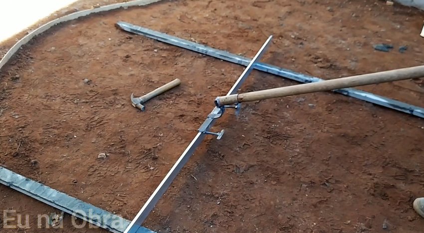 Укладываем на основание направляющие-ограничители, по которым будет скользить алюминиевый брус в процессе разравнивания бетонной массы, которую порциями подвозим тачкой с емкостью и предварительно разравниваем строительным мастерком между направляющими-ограничителями.