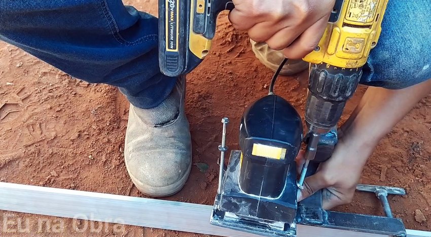 Алюминиевый прямоугольный брус длиной два метра центральной частью и на «ребро» помещаем между гайками и затягиваем двумя болтами. Площадку вибратора ставим на одну сторону жесткой стальной пластины с резьбовыми отверстиями и с помощью болтов надежно крепим к ней.