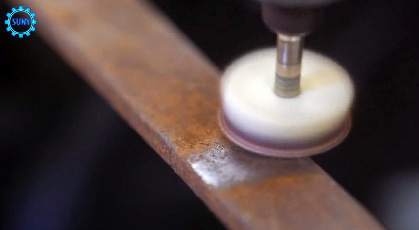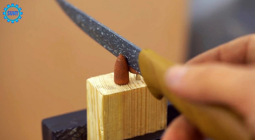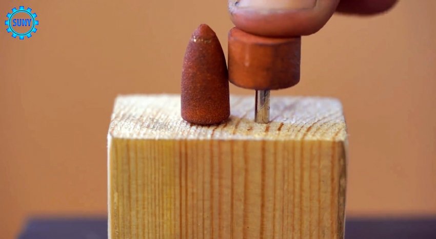 Возьмите брусок, и просверлите в нем два отверстия под хвостовики шлифовальных насадок для гравера. Вставляем один цилиндрический, а второй конический абразив так, чтобы они прилегали вплотную.