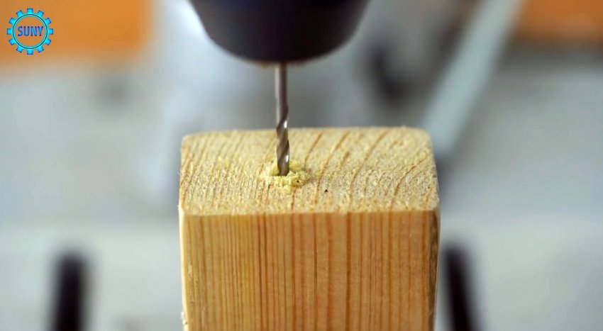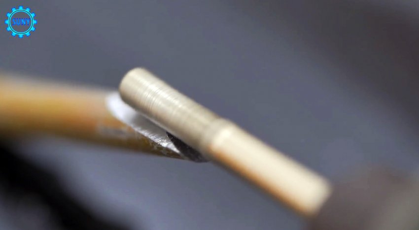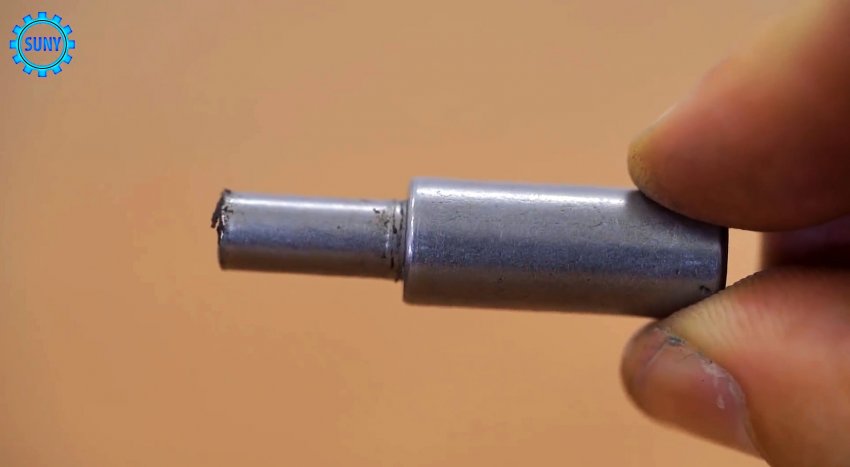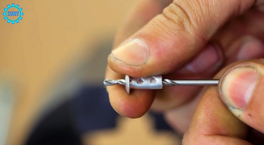 Вместо него вставали тонкое сверло. Теперь выставляем его выход на нужную глубину сверления, и обжимаем заклепку, чтобы она надежно держалась.