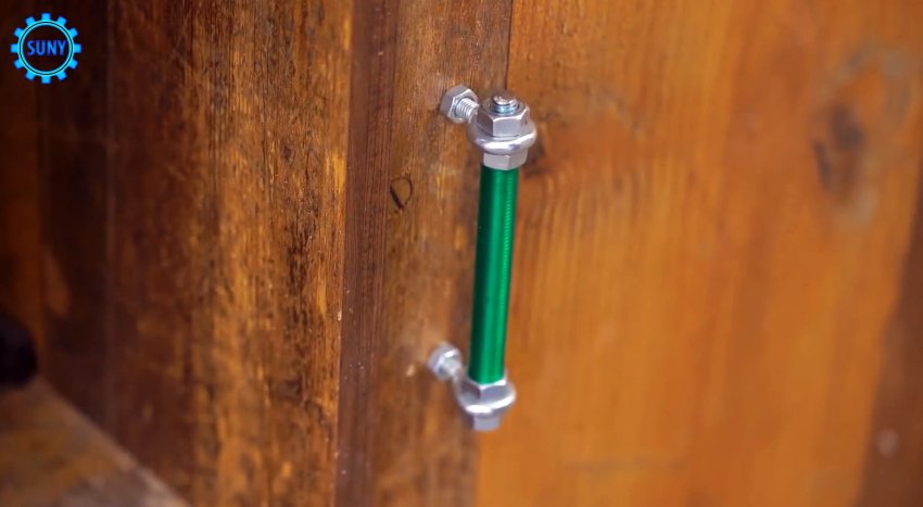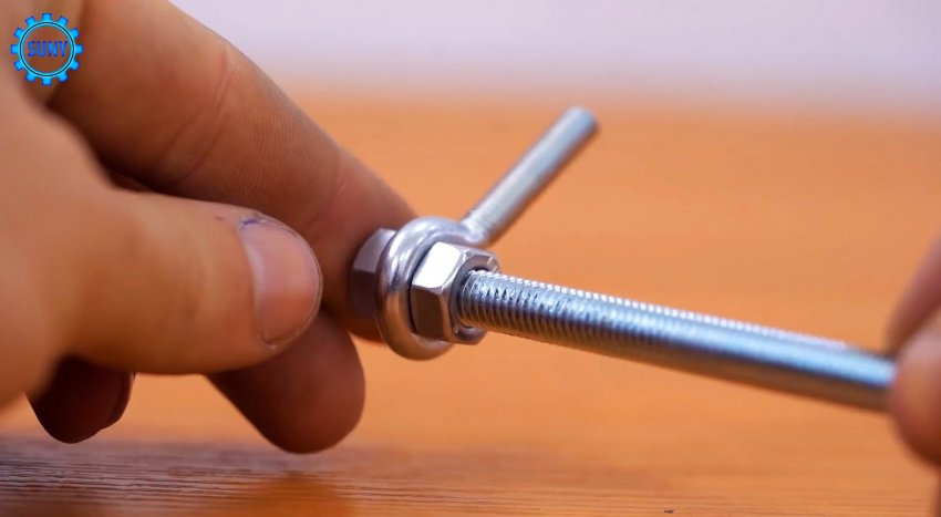 Для изготовления ручки возьмите отрезок резьбовой шпильки, и двумя гайками зажмите на ее конце болт с кольцом. Затем наденьте на резьбу шпильки трубку или шланг. После этого аналогично закрепляем болт с кольцом на другой стороне.