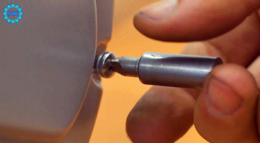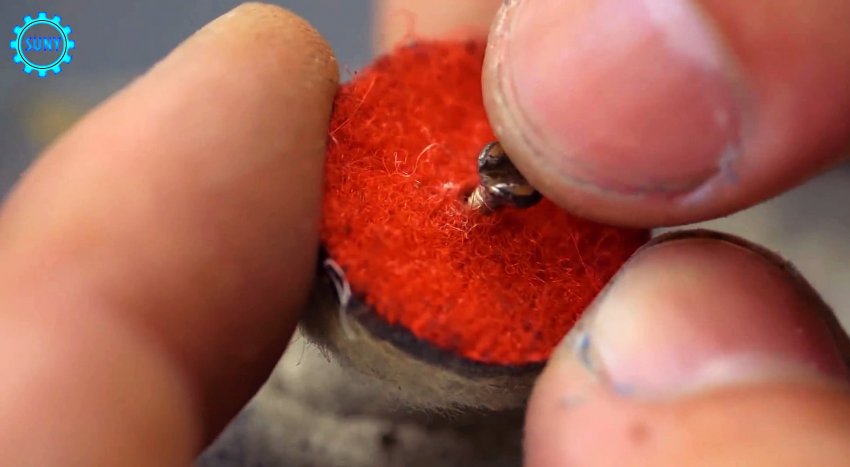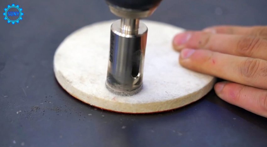 Сделать такую насадку можно высверлив коронкой насадку с липучкой для болгарки. Полученный диск просверливается в центре, после чего затягиваем на нем винт.