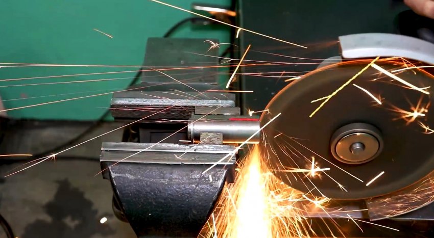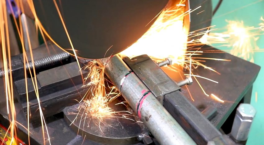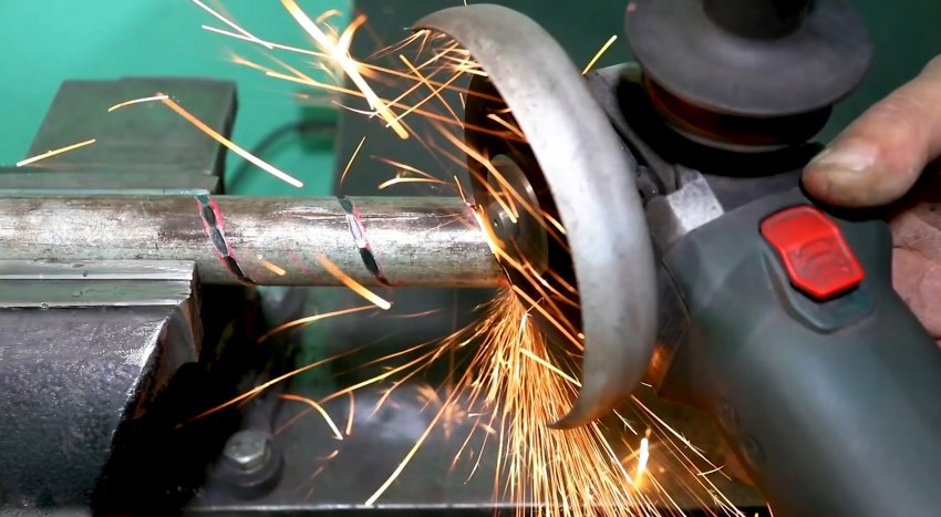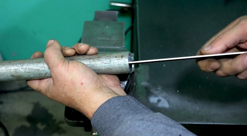 По спиральной линии на трубе выполняем прорезь, которую зачищаем. Заусенцы внутри трубы удаляем наждачкой на держателе дрелью.