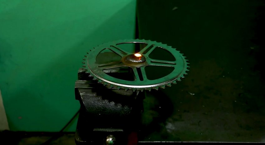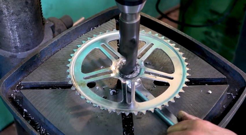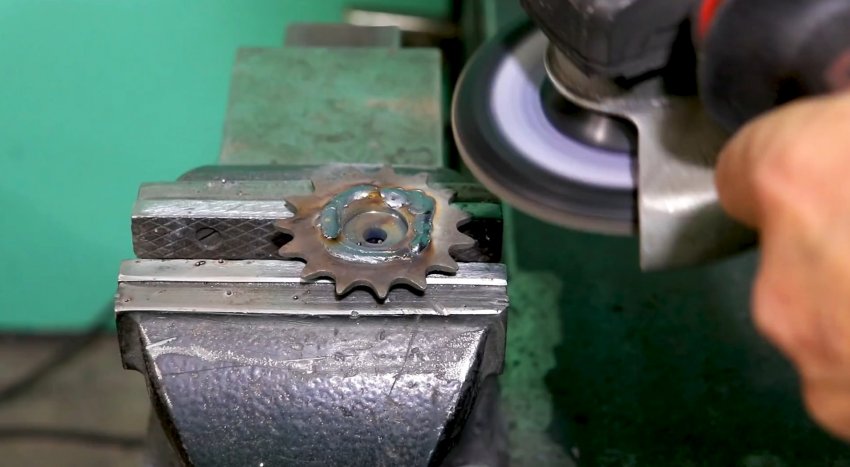 Отверстие в центре большой звездочки зенкуем, выбиваем насечки, надеваем на выступ цилиндра до упора в буртик, привариваем и шлифуем сварной шов.