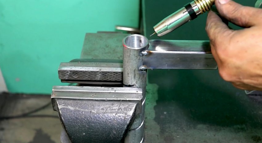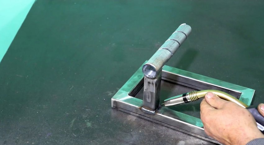 К концу трубы без прорези привариваем вертикально отрезок квадратной трубы. Из нее же свариваем прямоугольную раму и привариваем свободный конец стойки трубы к длинной стороне рамы со смещением от центра так, чтобы труба располагалась над рамой.