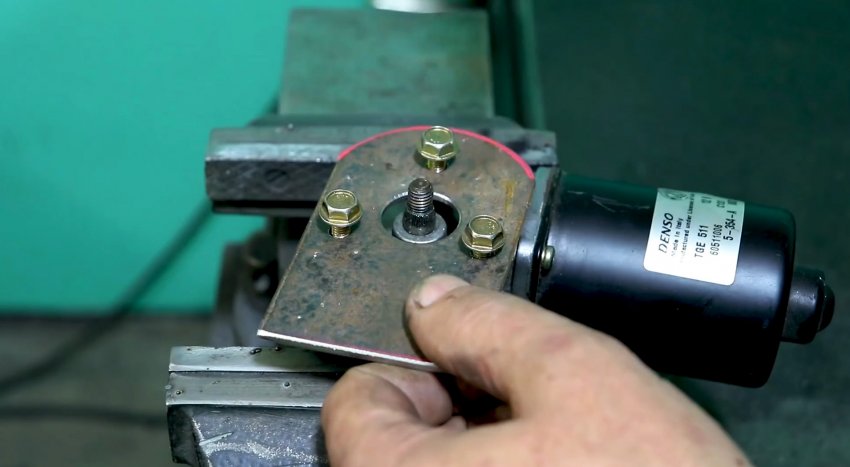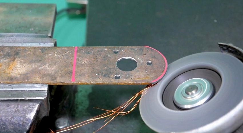 Переносим элементы кронштейн мотора-редуктора на стальную полосу и выполняем их на сверлильном станке. Формируем внешний контур и отрезаем от полосы фрагмент нужной длины.