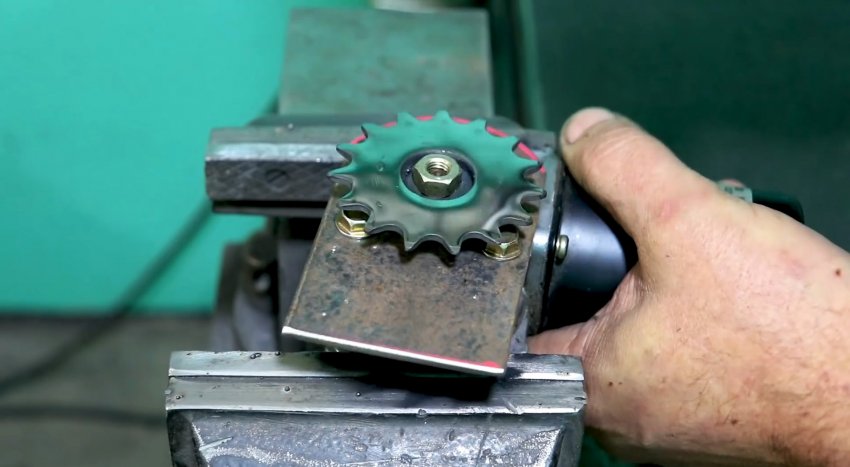 В отверстие малой звездочки помещаем втулку-вставку, завариваем и шлифуем сварной шов. Фрагмент из полосы закрепляем болтами на моторе-редукторе. На ось редуктора надеваем малую звездочку и затягиваем гайку.