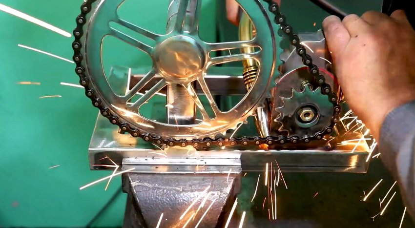 Планку с цилиндром вводим в трубу со спиральной прорезью, а на большую звездочку надеваем велосипедную цепь. Натягиваем малой звездочкой цепь и фиксируем сваркой кронштейн на раме, который надежно обвариваем.