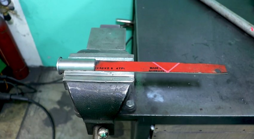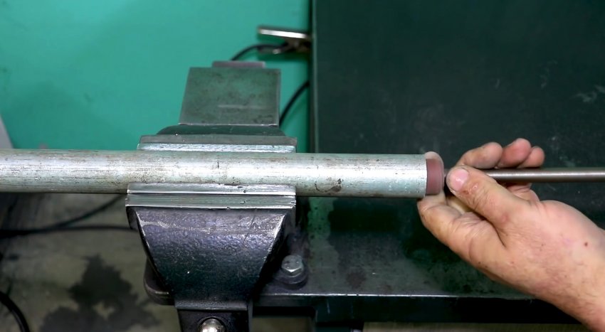 Вставляем в трубу планку с цилиндром до упора в буртик. Отрезаем выступающий из трубы конец и скругляем углы.