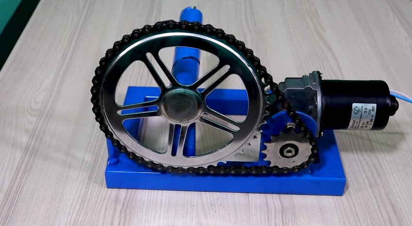 Смазываем цилиндр и зубцы звездочек. Все надежно закрепляем и соединяем звездочки цепью. Подключаем к мотору провода и машина готова к работе.