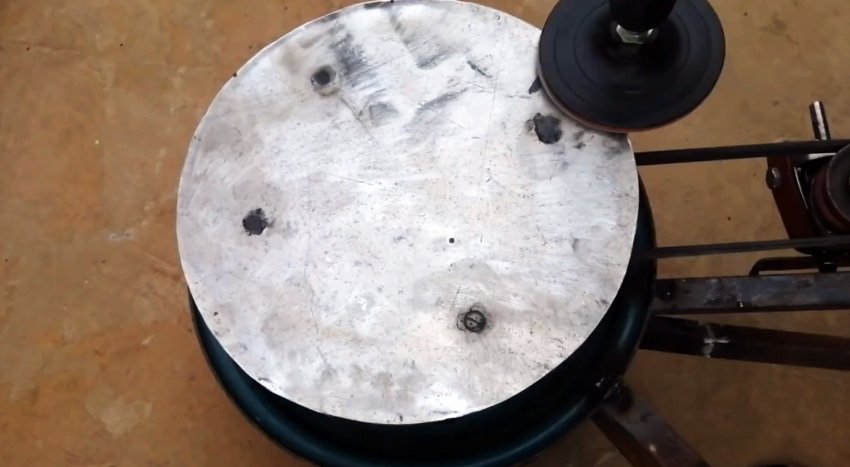 Теперь нужно прикрутить на тормозной диск основание для крепления наждачки. Это может быть алюминиевый лист, фанера или другой прочный листовой материал. Винты крепления вкручивают в заранее просверленные отверстия с нарезанной резьбой. Шляпки прячем впотай. Затем засыпаем отверстия металлическими опилками, и пропитываем их суперклеем. Это позволяет получить ровную плоскость.