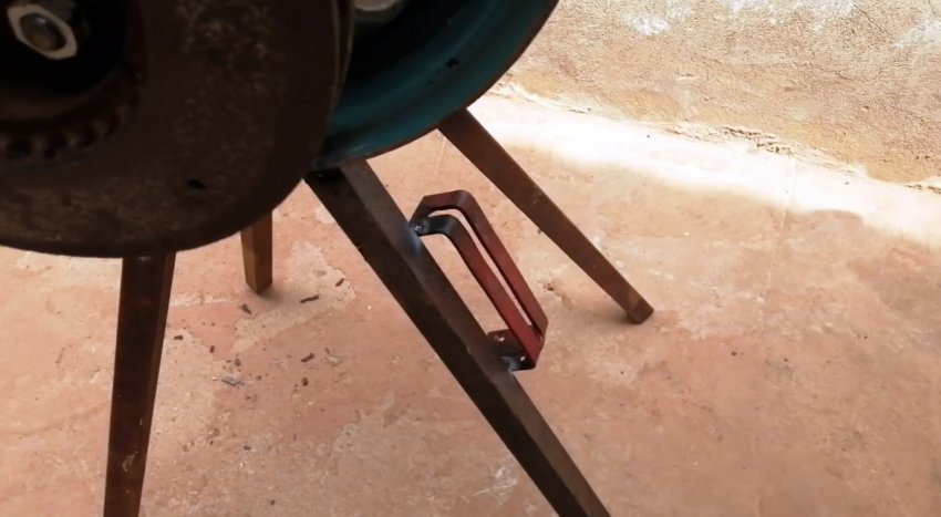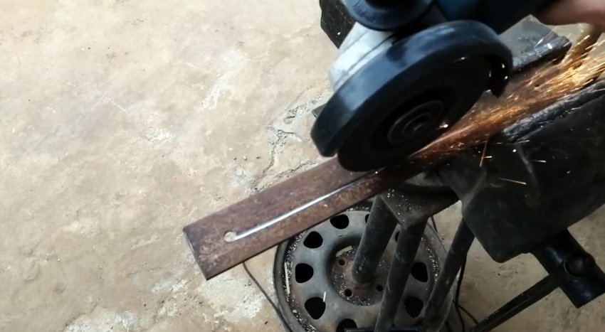 Теперь нужно заняться приводом наждака. Для этого из полосы изготавливается кронштейн для крепления редуктора болгарки. Он приваривается к ножке станины.