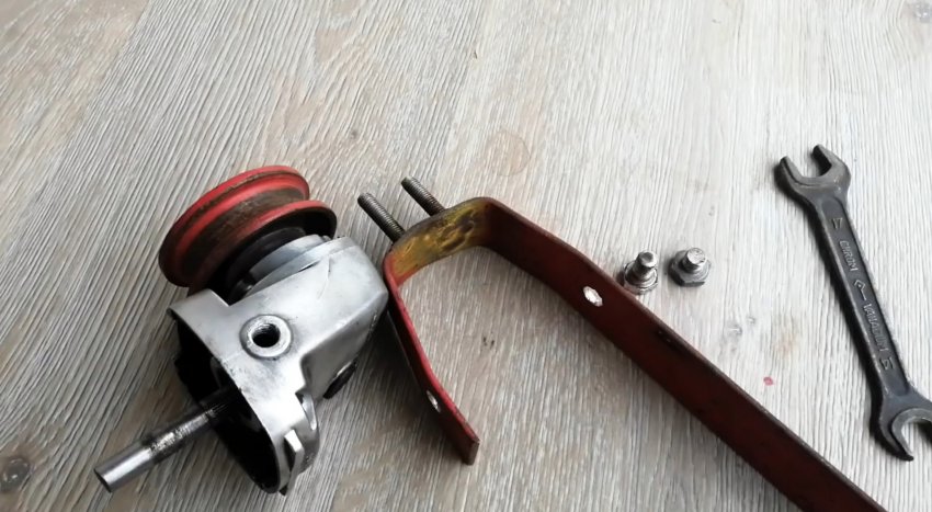 К кронштейну прикручивается редуктор от болгарки с установленным шкивом. Это делается через переходник из полосы, чтобы иметь возможность в будущем натягивать приводной ремень. Обратите внимание, что переходник имеет запас длины, чтобы потом крепить к нему дрель.