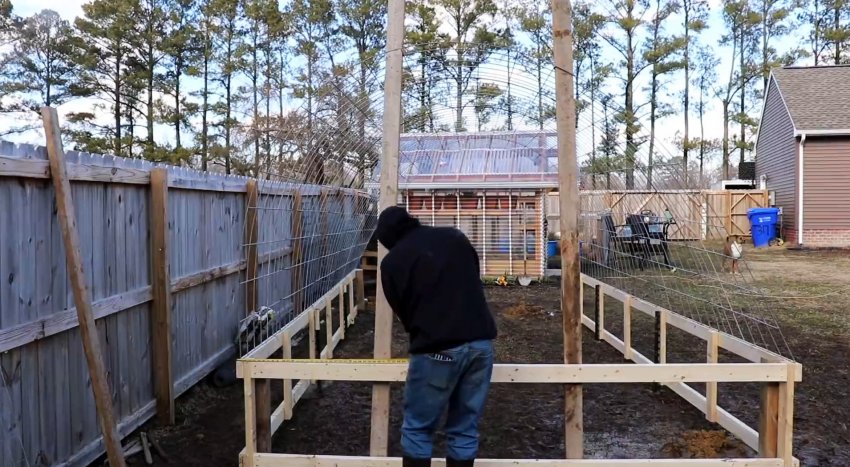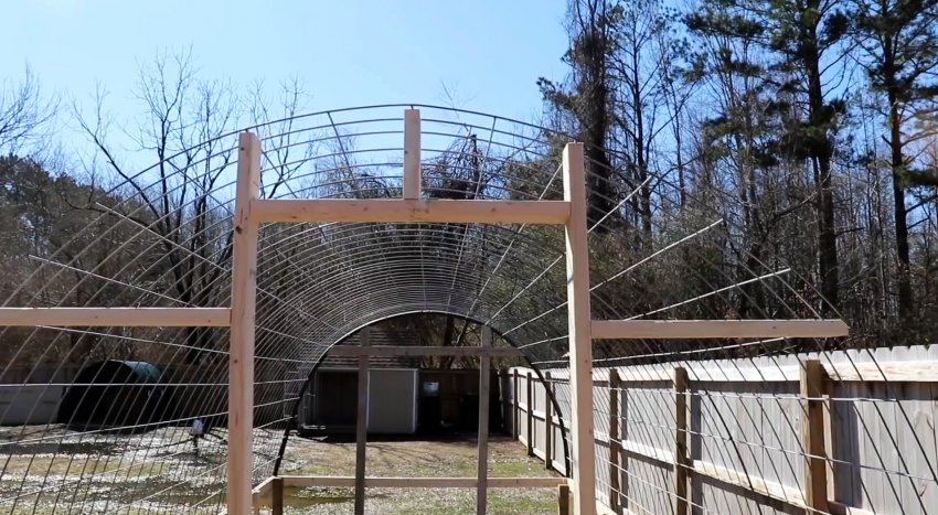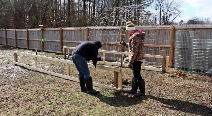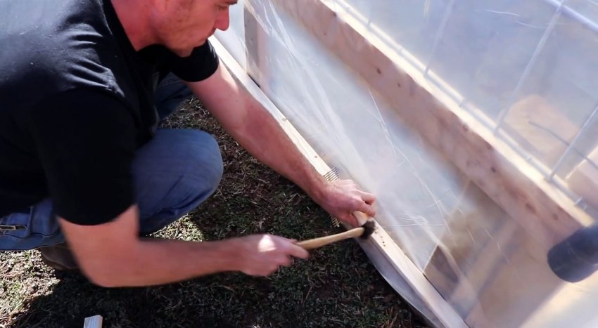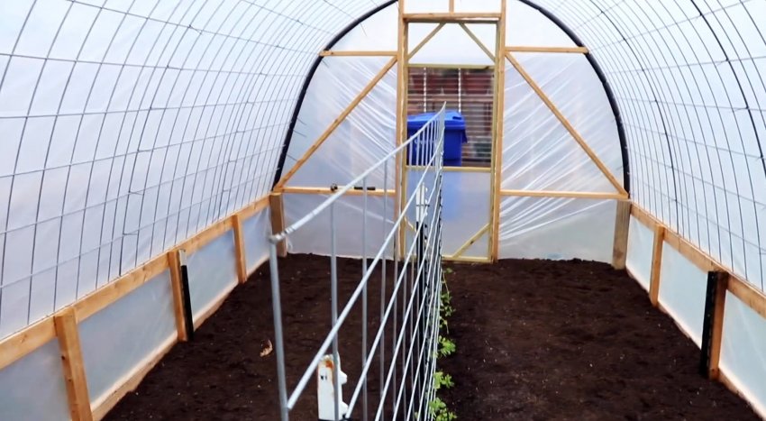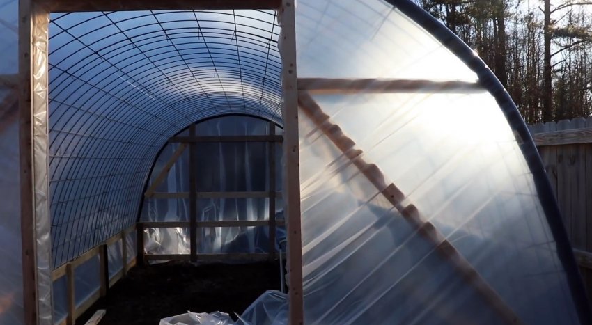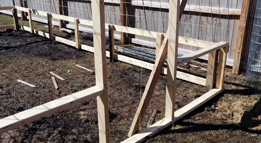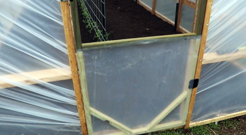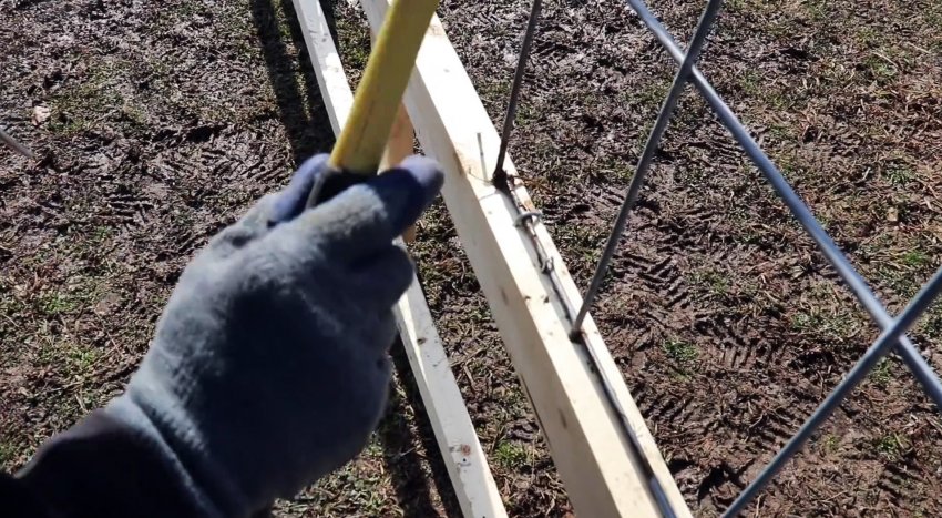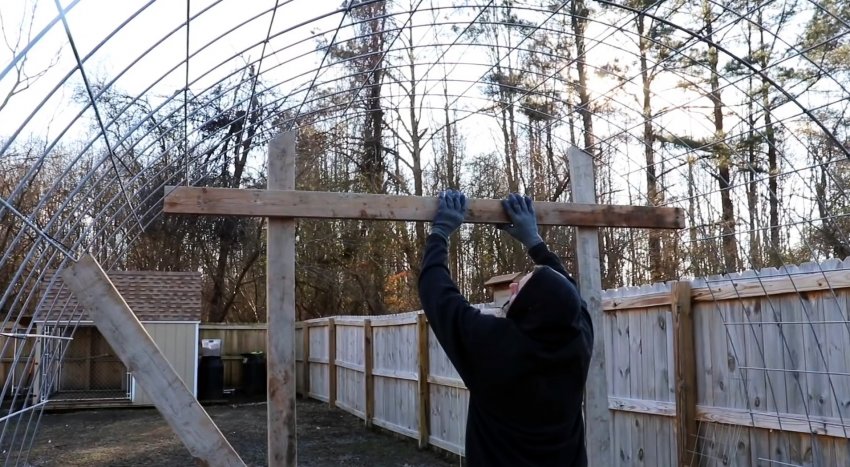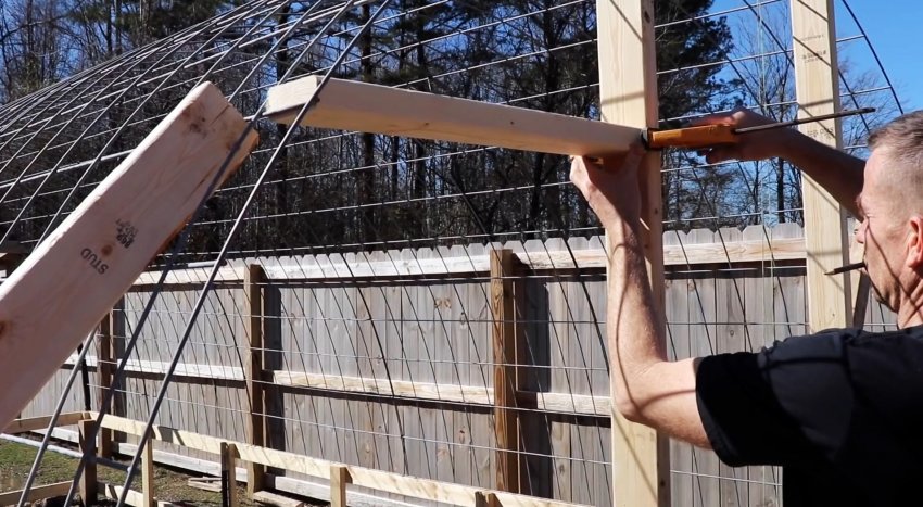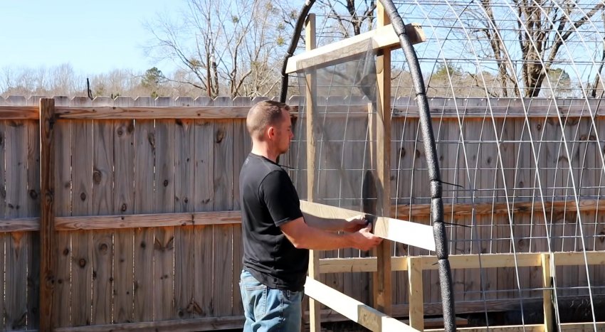 Со стороны глухого торца теплицы собираем деревянный каркас. Сначала прибиваем рейку между бортами. Затем из бруска ставим стойки. Сверху прибиваем к ним сетчатую арку. После этого конструкция станет намного жестче.