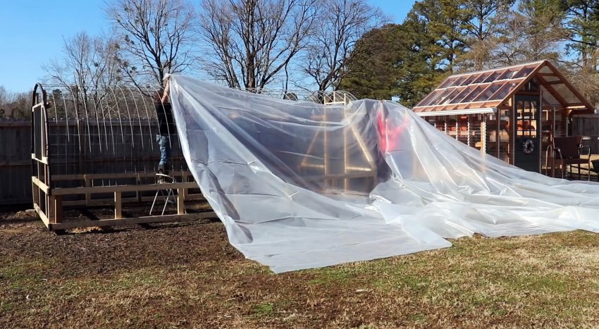После готовности каркаса нужно набросить на теплицу пленку. Если такого куска как вам нужно нет, то его можно спаять из нескольких. Пленка берется с запасом по длине, чтобы сразу перекрыть и торцы теплицы.