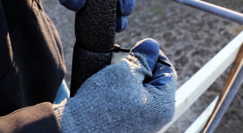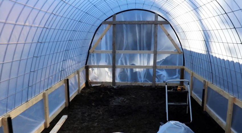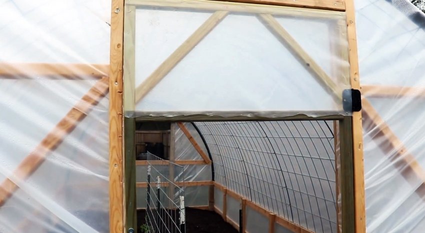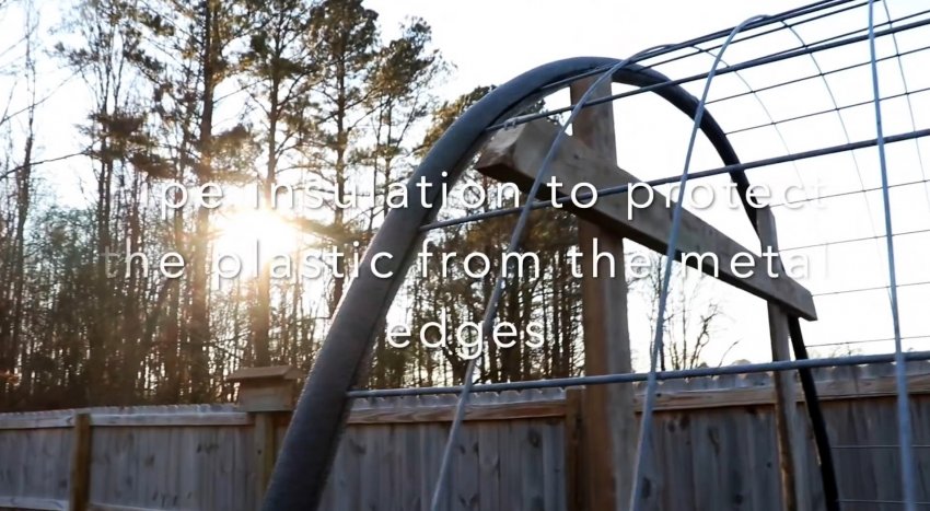 Аналогично собирается каркас и со стороны входа, но из стоек нужно сформировать дверной проем. Для жесткости с торцов прибиваются укосины. Затем на края арки надевается вспененная изоляция для труб. Это убережет пленку от прокалывания.