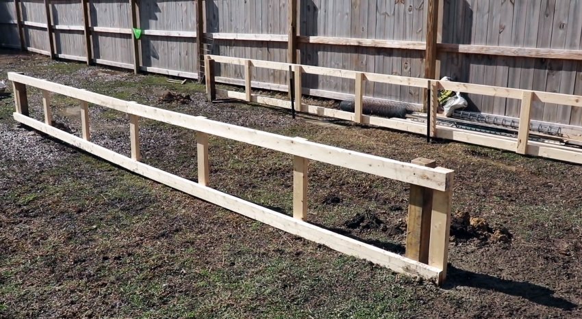 Полученные бортики устанавливаем на участке с помощью столбиков и колышков. Они должны стоять строго вертикально, и быть параллельными друг другу.