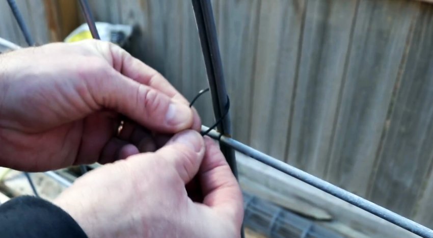 Далее берем полосы кладочной сетки, и формируем из них арку теплицы. Они выгибаются, и приколачиваются гвоздиками к бортам.