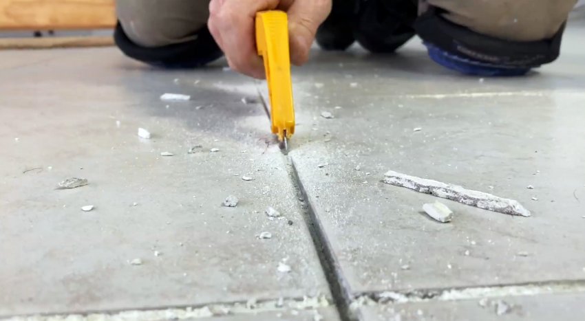 Затем скребком по кафелю зачищаем швы вокруг них от фуги и клея. В результате с боков плитку ничего не должно удерживать.