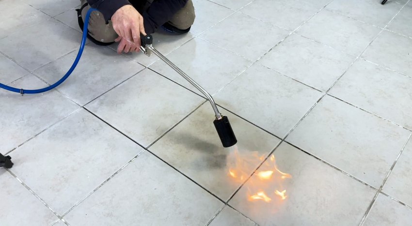 Далее берем газовую горелку, и равномерно греем проблемную плитку по всей площади. В результате нагрева она начнет расширяться, но так как линейное расширение у нее с плиточным клеем разное, то он должен отойти.