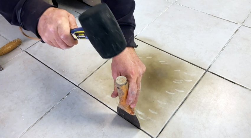 Пока плитка горячая, аккуратно подбиваем ее резиновой киянкой. Как итог, клей окончательно отойдет. Теперь останется поддеть плитку широким шпателем. Местами она еще будет немного держаться, поэтому по шпателю можно аккуратно постучать киянкой.
