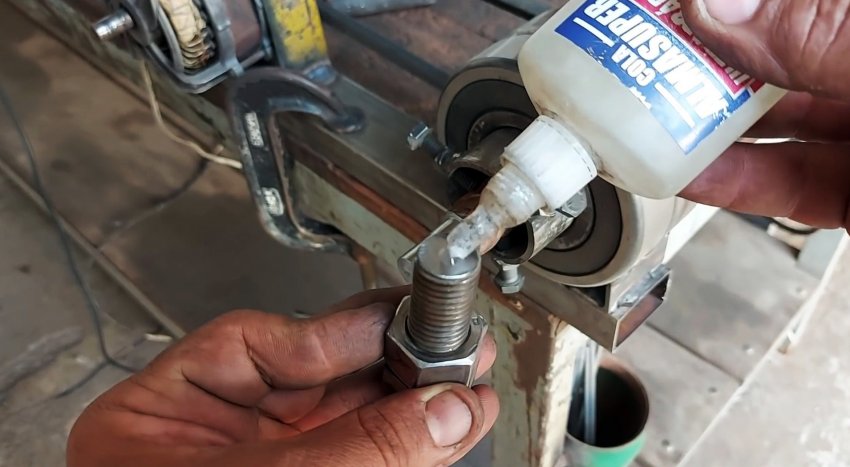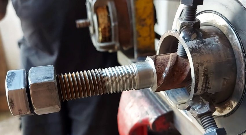 На торце заготовки приклеивается болт с резьбой, которую нужно нарезать. На него обязательно должна быть накручена гайка.