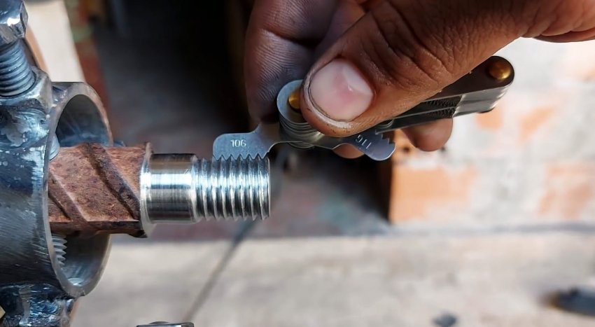 После этого прикладываем напильник в начало резьбы, и запускаем вращение станка, чтобы инструмент продвигался в конец. Повторяем так раз за разом, пока резьбомер не покажет нужную глубину резьбы.