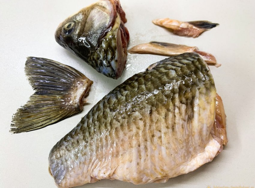 2. Чтобы на жарку карася понадобилось меньше масла, отрезаем плавники, хвостовую часть и голову. Из отрезанных частей получится вкусный рыбный суп.