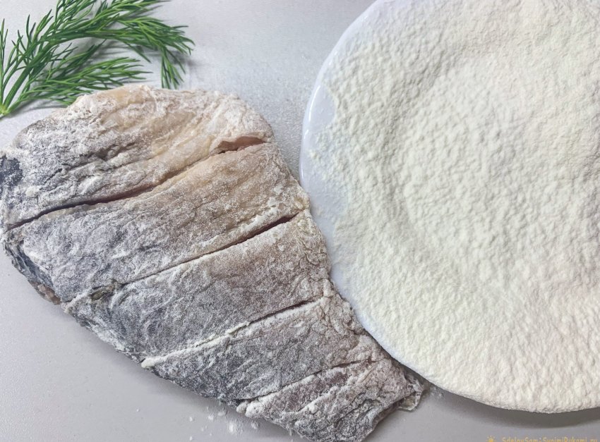 5. Просеиваем муку на плоскую тарелку и щедро обваливаем в ней карася. Благодаря муке получается аппетитная хрустящая корочка.