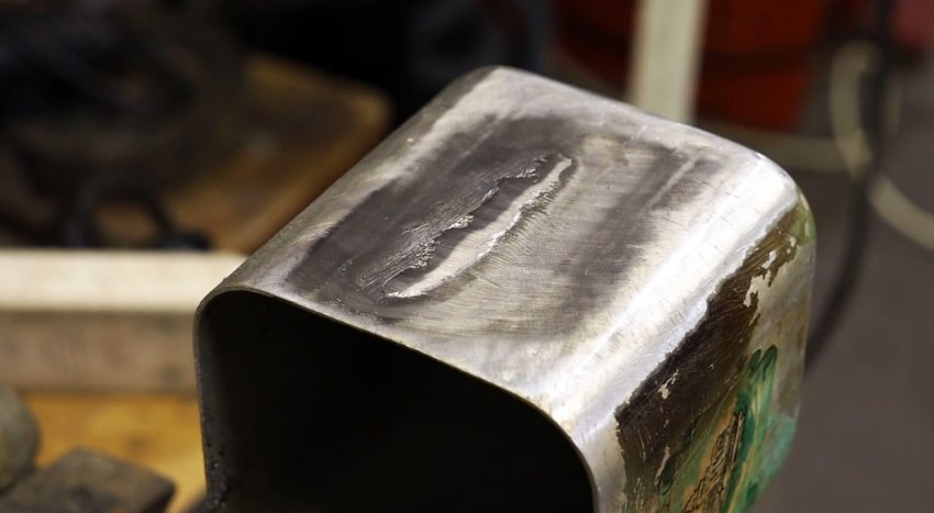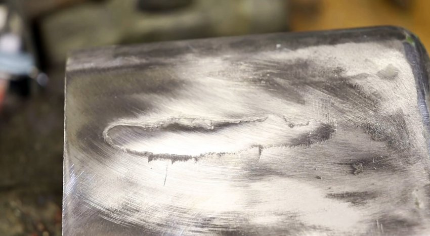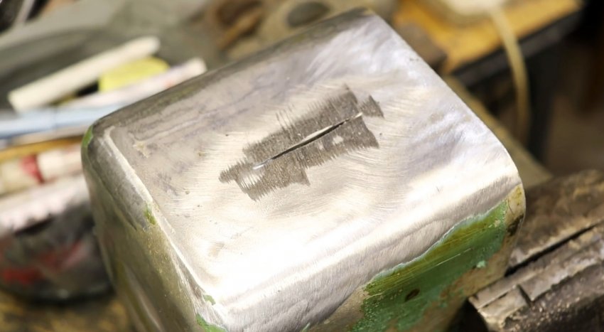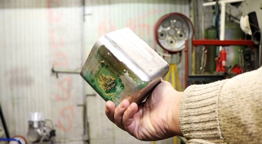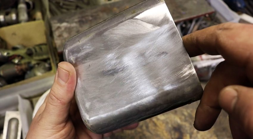 При этом убеждаемся в том, что поверхность отлично запаялась, и после ее остывания приступаем к шлифовке с помощью обычной болгарки. После окончания процесса шлифовки, замечаем, что пайка получилась монолитной, в чем убеждаемся, налив в контейнер воды. Ни одной капли и даже подобия влаги снаружи не удается обнаружить.