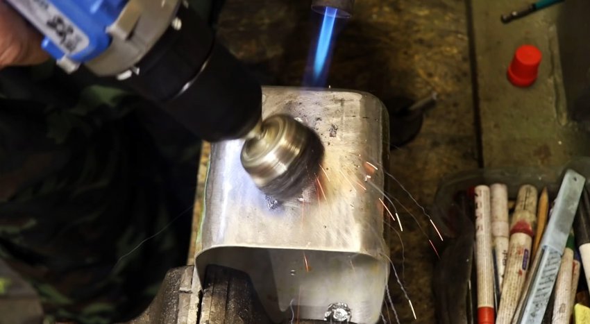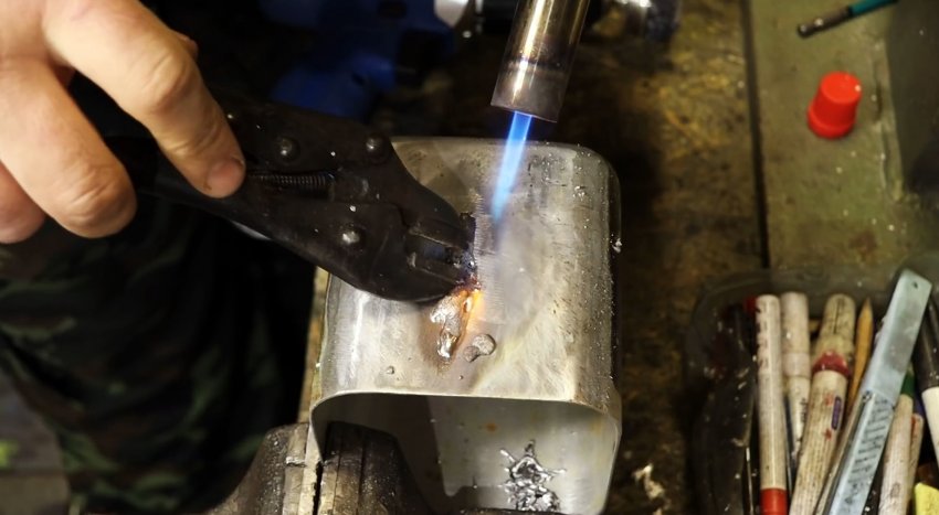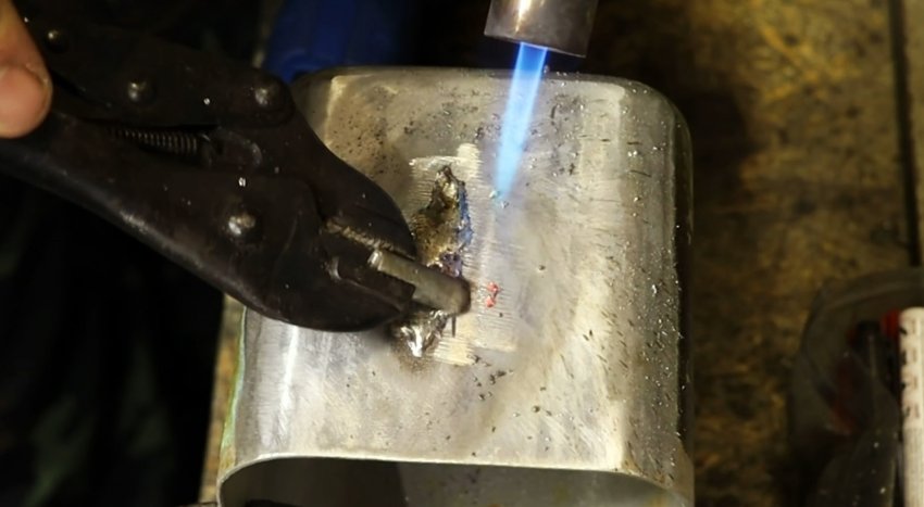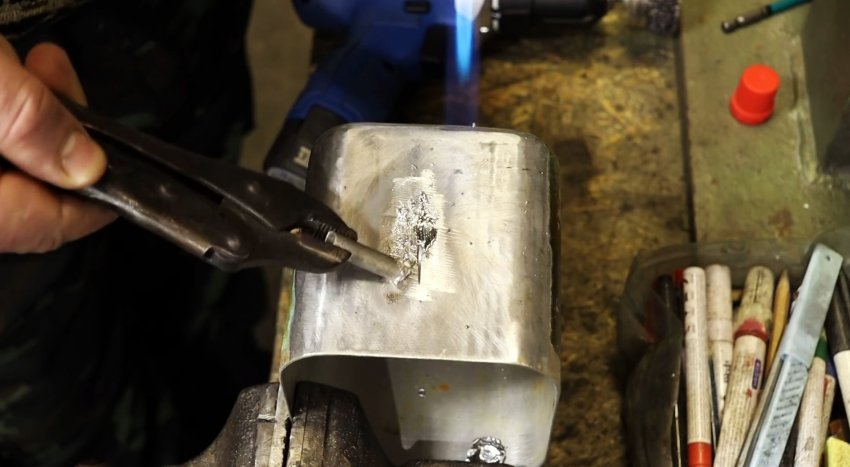 Для этого закрепляем контейнер из алюминия в слесарные тиски, прогреваем поверхность вокруг трещины пламенем газовой горелки, расплавляем небольшое количество олова, которое удерживая клещами, распределяем тонким слоем вокруг поврежденного места.