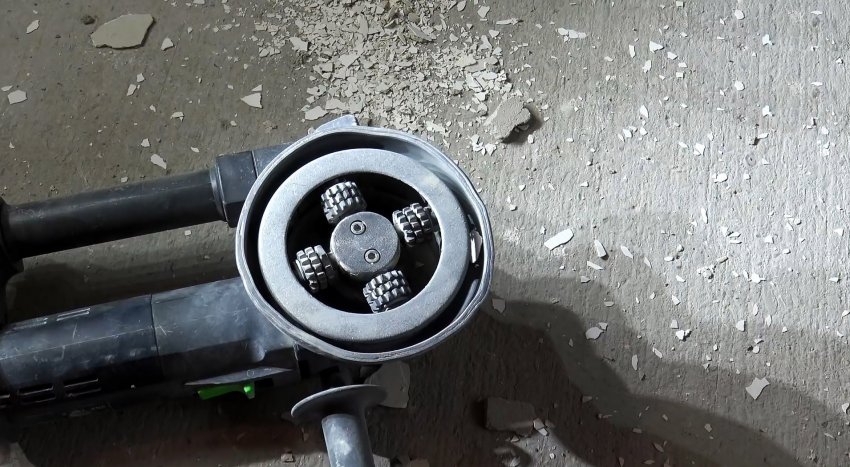 Она работает подобно болгарке с алмазным диском, но имеет ударное воздействие. За счет этого она буквально обдирает, и одновременно сбивает из оснований покрытия. Даже если то неровное, она позволит выбить плохо удерживающуюся штукатурку или стяжку с углублений.
