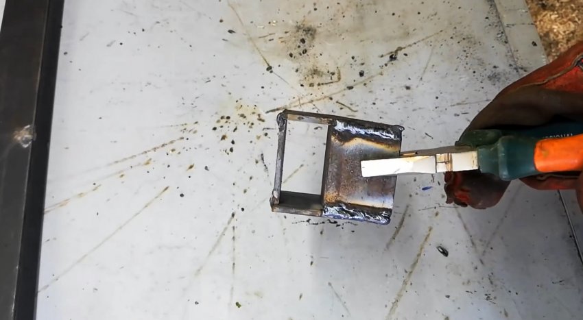 Сжимаем узел струбциной и привариваем детали друг к другу. Получаем неразъемную коробчатую конструкцию, которая может свободно скользить по профильной трубе. Изготавливаем 8 таких узлов.