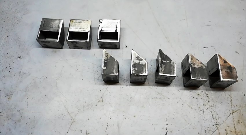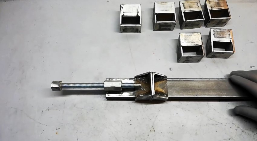 Разрезаем стальной уголок 40?40 мм и стальную полосу шириной 40 мм на отрезки длиной 50 мм, а квадратный стержень – равный высоте соединительных гаек.